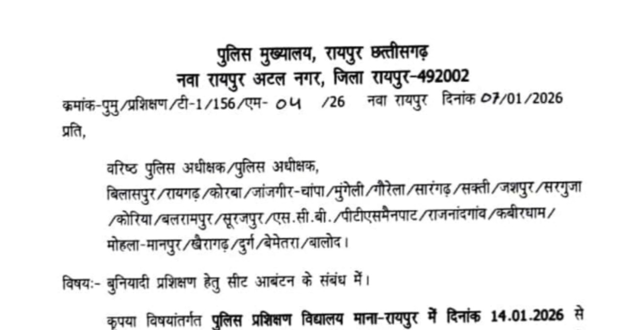 1. प्रशिक्षण तिथि बुनियादी प्रशिक्षण 14.01.2026 से पुलिस प्रशिक्षण विद्यालय, माना-रायपुर में शुरू होगा।